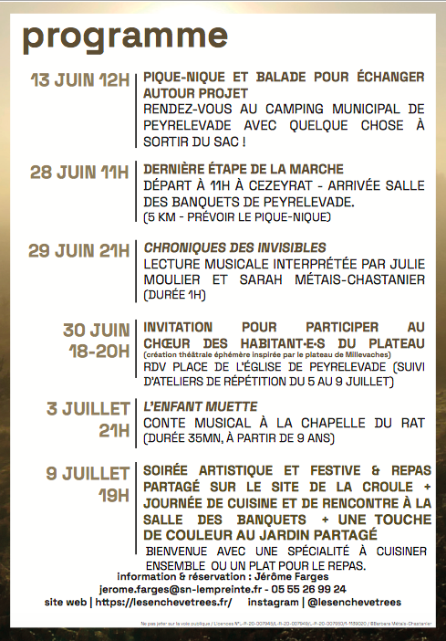 Après 10 jours de marche, nous arriverons donc le 28 au soir à Peyrelevade pour prolonger l’aventure avec une résidence de quinze jours pour continuer à partager cette enquête avec les habitante·s. Au programme : des lectures musicales (les 29 juin et 3 juillet), un repas partagé (le 9 juillet), des fresques réalisées par Saul Pandelakis en différents endroits du village, mais aussi deux ateliers de théâtre ouverts à toutes et tous. Le premier : un Choeur des habitant.e.s inspiré des expériences de vie du plateau qui donnera lieu à une représentation lors du banquet ; le second : une balade sonore qui donnera lieu à des enregistrements participatifs et à des récoltes de son partagées.
