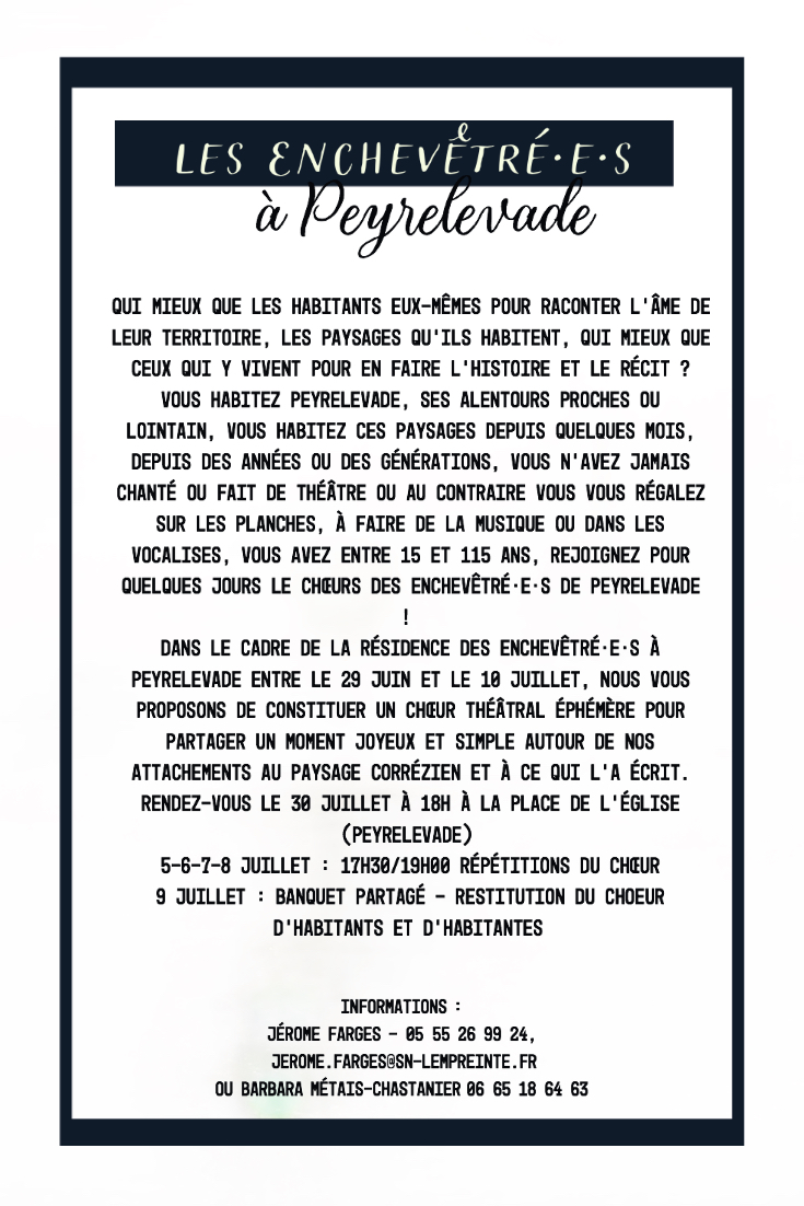 30 juin : Choeur des habitant·e·s à 18h – RV place de l’église de Peyrelevade : Discussion et échange avec les habitant·e·s autour de Peyrelevade, de son histoire, de ses paysages, pour inspirer l’écriture du texte du Choeur des habitant·e·s, suivi de répétitions (5-9 juillet)