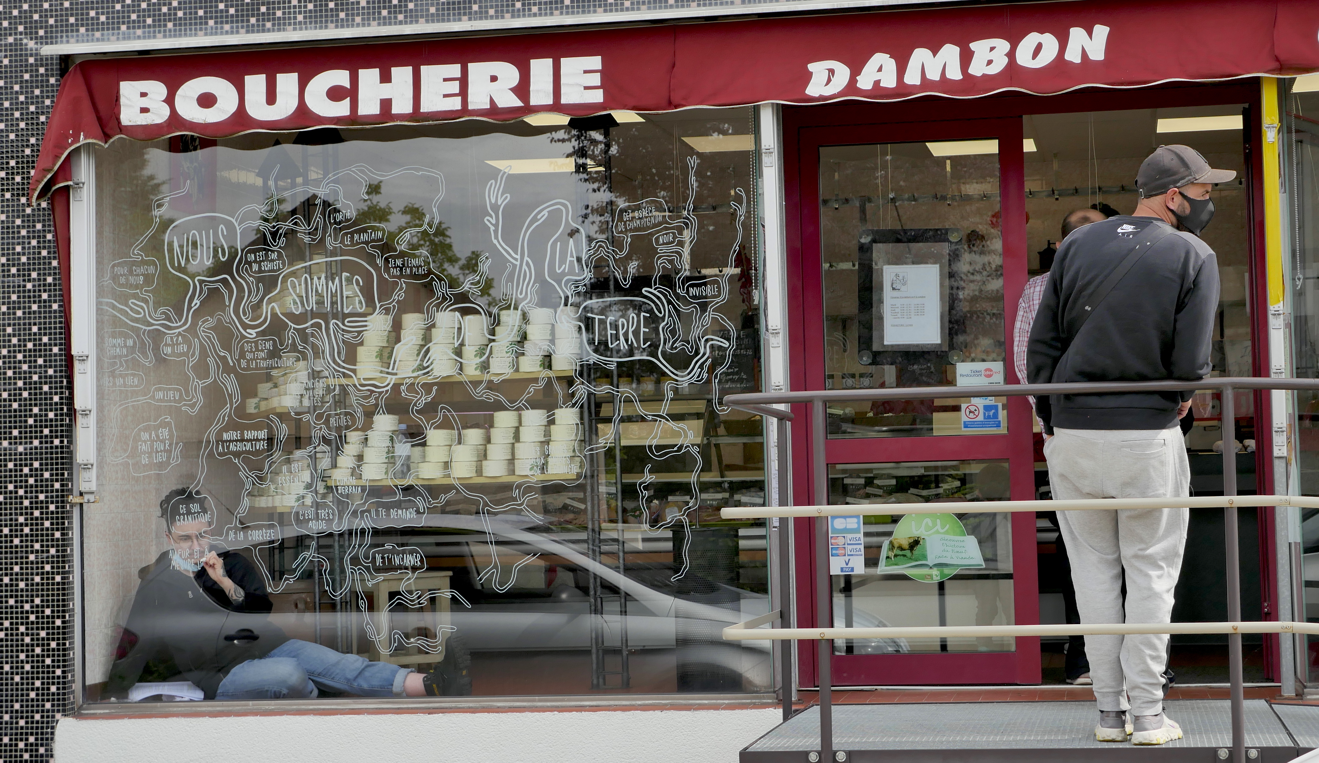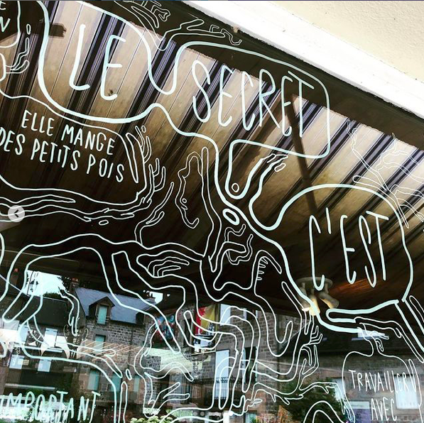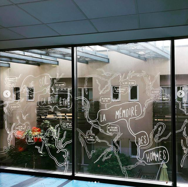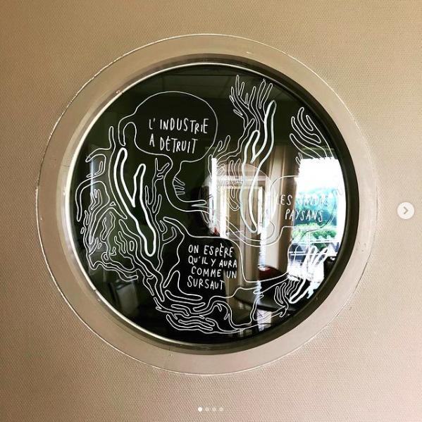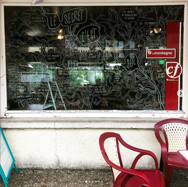 Réalisée sur plusieurs grandes surfaces vitrées, dispersées dans le centre ou sur le site du banquet final, la fresque trouve un écho à une autre échelle dans la carte, imprimée en riso chez Pépite collectif.