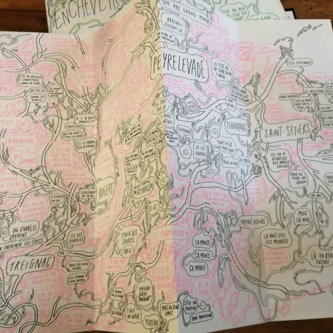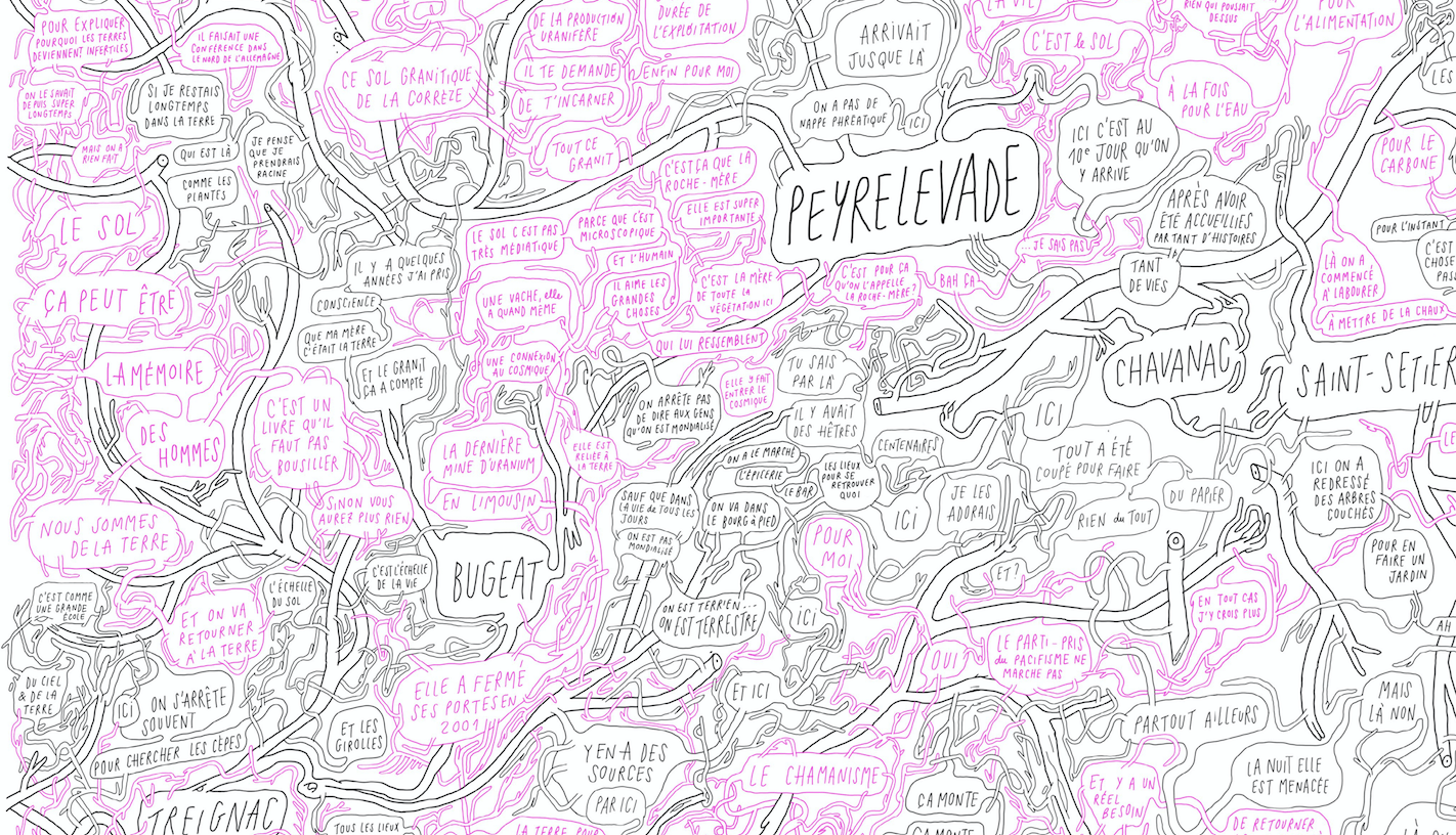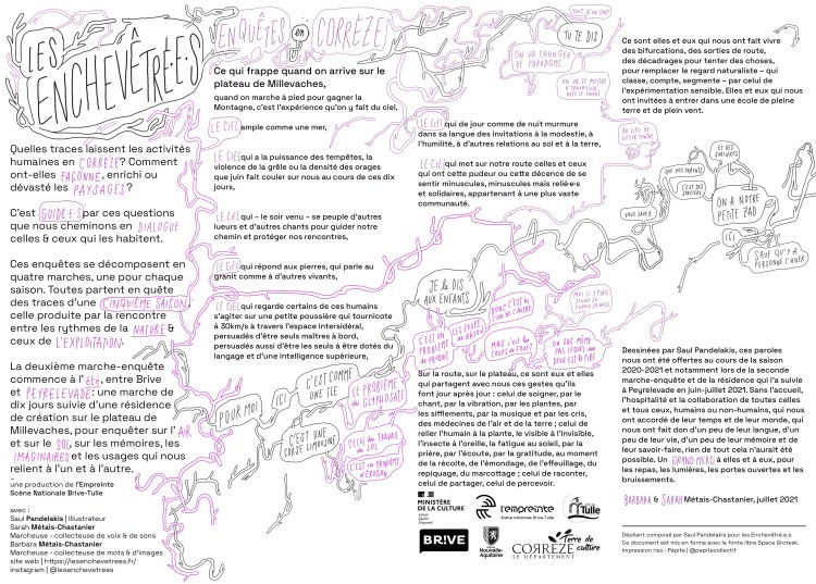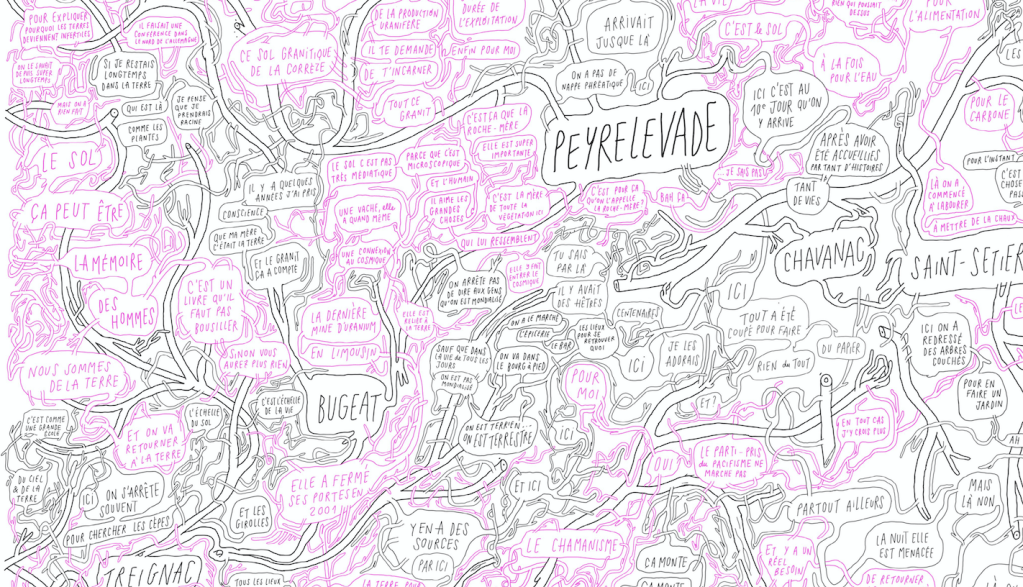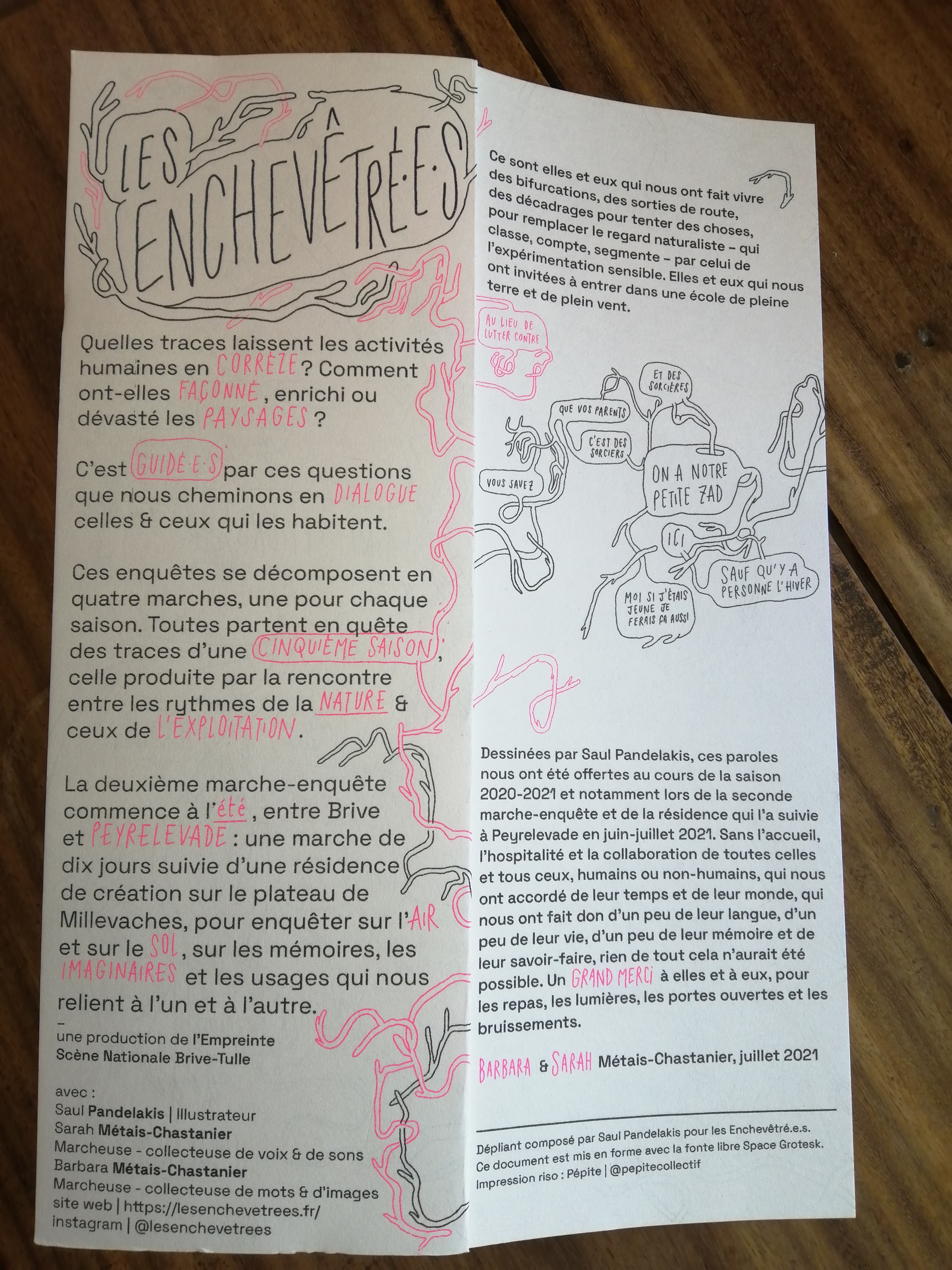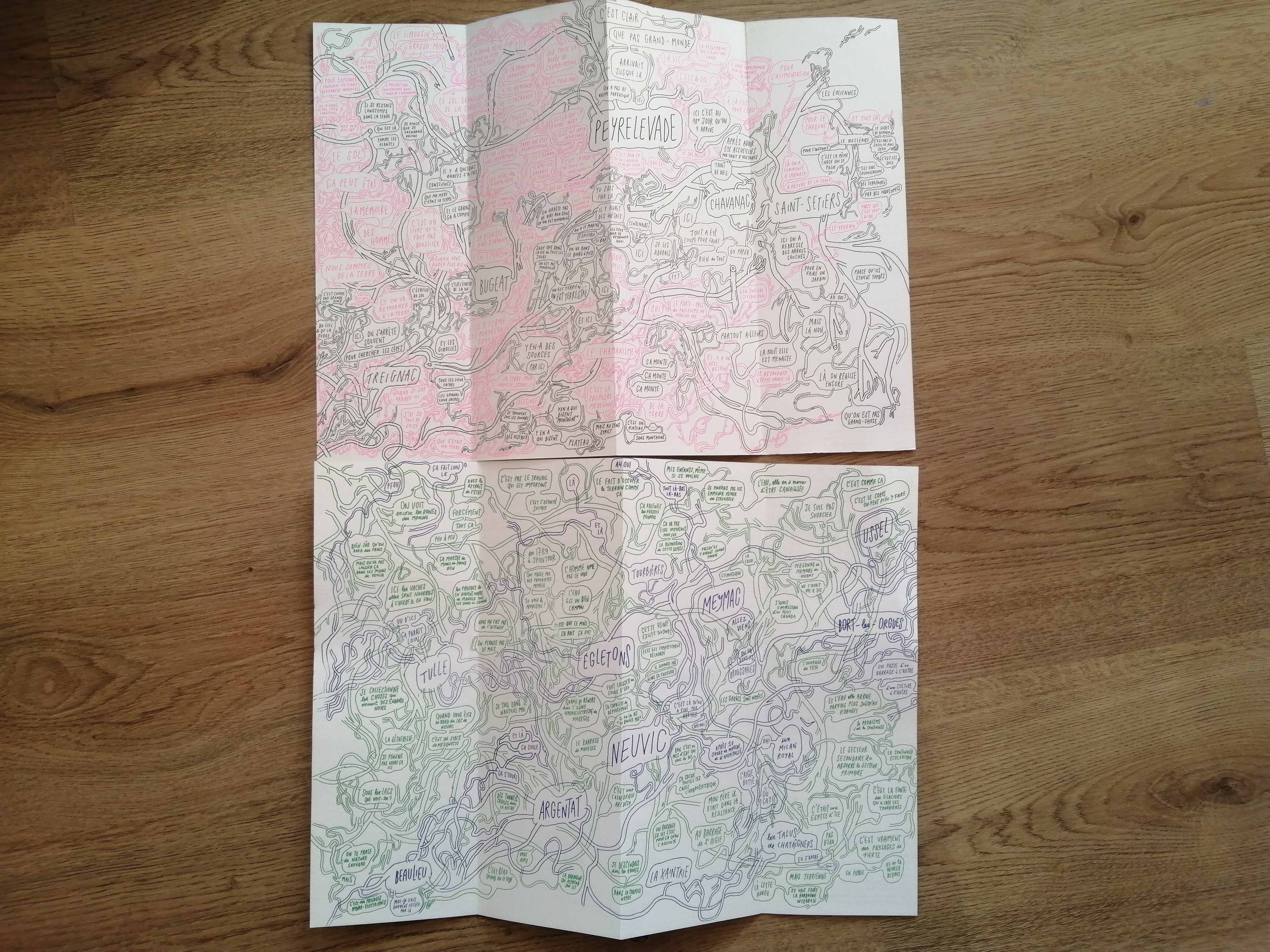 Seconde carte d’une série de quatre, la Carte de l’air & du sol (du ciel & de la terre) s’est constituée au fil des rencontres lors la marche-enquête jusqu’à Peyrelevade en juin 2021. D’abord dispersée par Saul Pandelakis sous forme de fresques dans différents lieux de vie du village (café , EHPAD, boucherie, épicerie) lors de la résidence de création des Enchevêtré·e·s à Peyrelevade en juillet 2021, elle prend maintenant forme en plusieurs volets d’impression riso. Fragments de discussion, d’entretien ou d’atelier avec des habitante·s, s’y retrouvent pour composer ce kaléidoscope des complicités et connivences que nous entretenons avec l’air comme avec le sol, ici, sur le plateau de Millevaches et plus globalement en faisant le chemin qui mène de Brive-la-Gaillarde à la Montagne limousine.