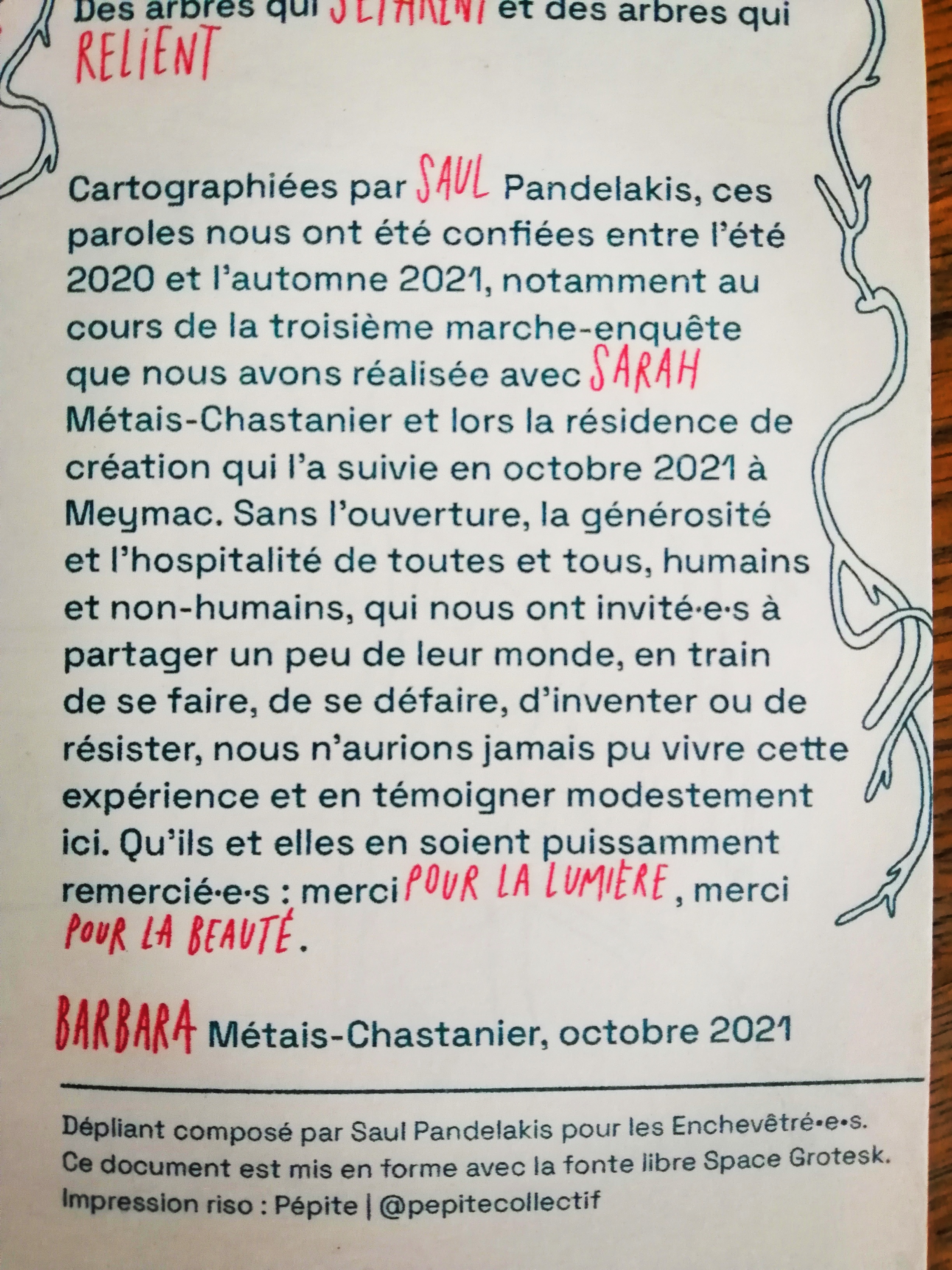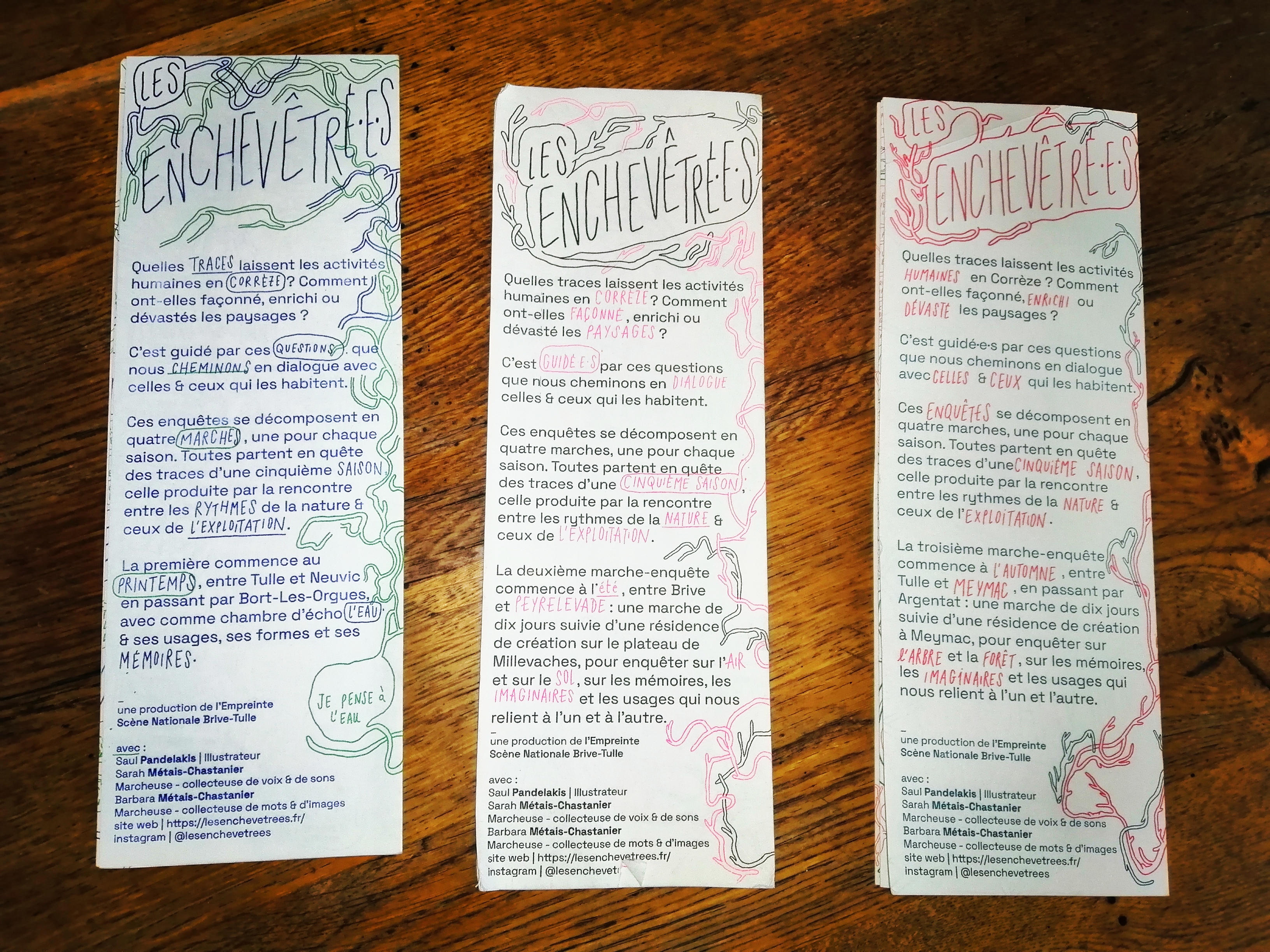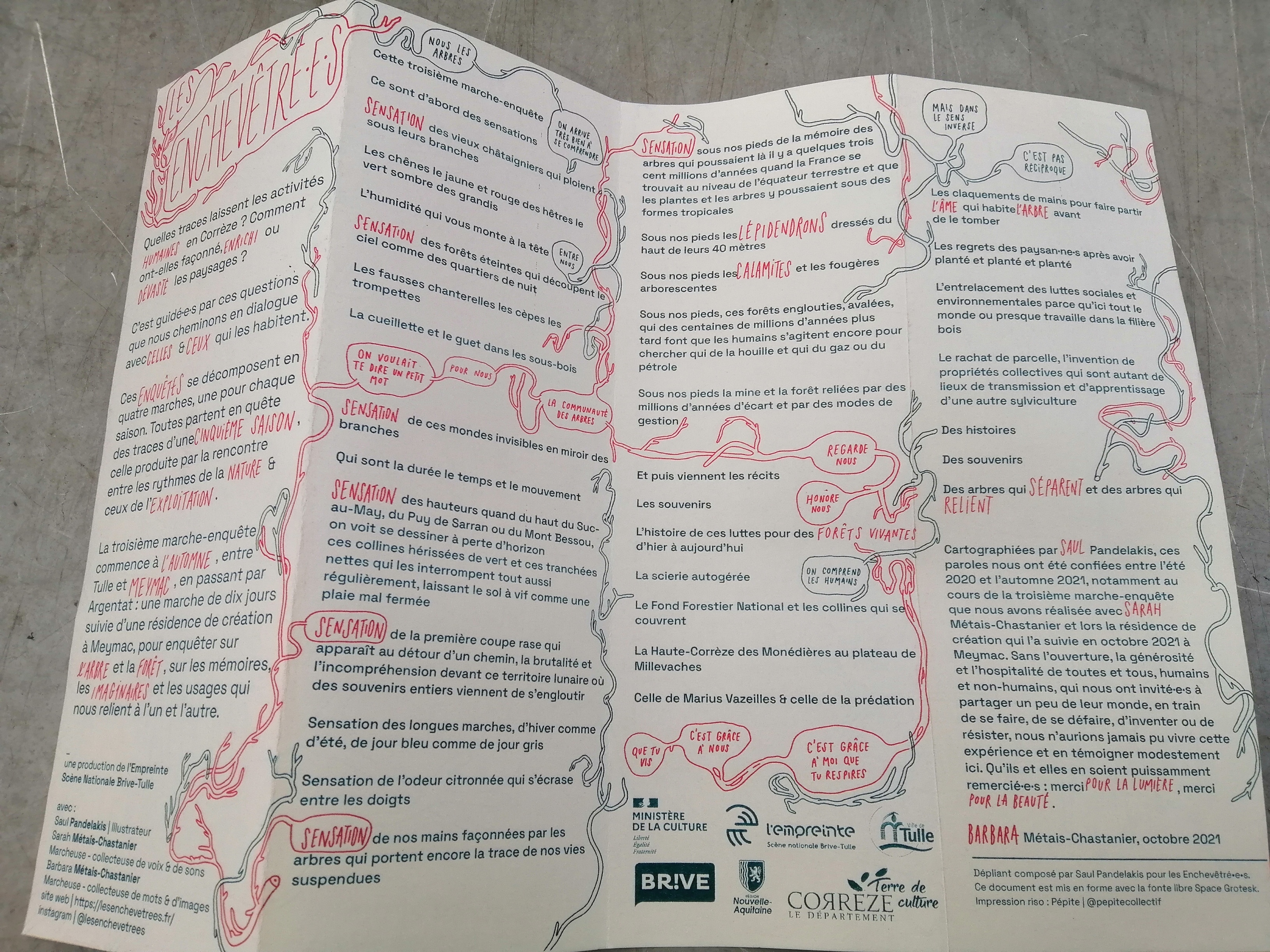Troisième carte d’une série de quatre, la Carte de l’arbre & de la forêt s’est constituée au fil des rencontres lors la marche-enquête reliant Tulle à Meymac en passant par Brive en octobre 2021. La constellation de paroles des habitant·e·s s’est invitée dans lors de la résidence de création des Enchevêtré·e·s au lycée forestier de Meymac et sur des vitrines de la ville en octobre 2021, elle prend forme à présent dans sa version papier, imprimée en riso. Fragments de discussion, d’entretien ou d’atelier avec des habitant·e·s, s’y retrouvent pour composer un labyrinthe habité, une cartographie des conduites et contre-conduites qui écrivent, braconnent ou transgressent les espaces forestiers et les milieux vivants : après l’eau, le sol et l’air, voici donc la carte de l’arbre, un cheminement dans les forêts et les plantations limousines, le récit des constellations de la troisième marche-résidence entre Tulle, Argentat et Meymac illustrée par Saul Pandelakis (@saulpandelakis), imprimée par Vivien Gorse (@pepiteworld), écrite par Barbara Métais-Chastanier à partir de témoignages recueillis avec Sarah Métais-Chastanier (@sarahmc_pub).