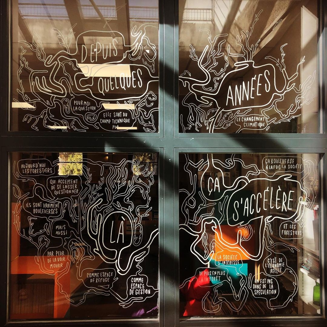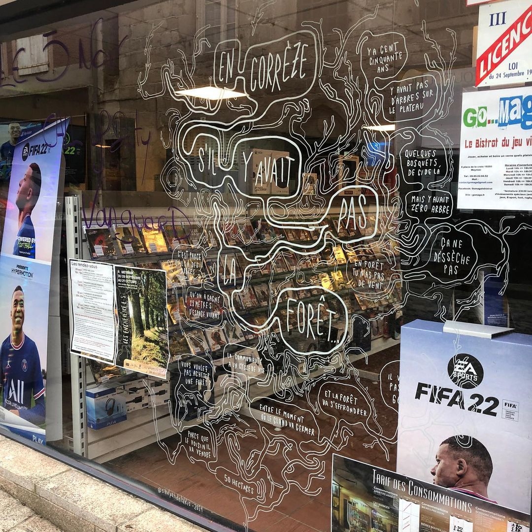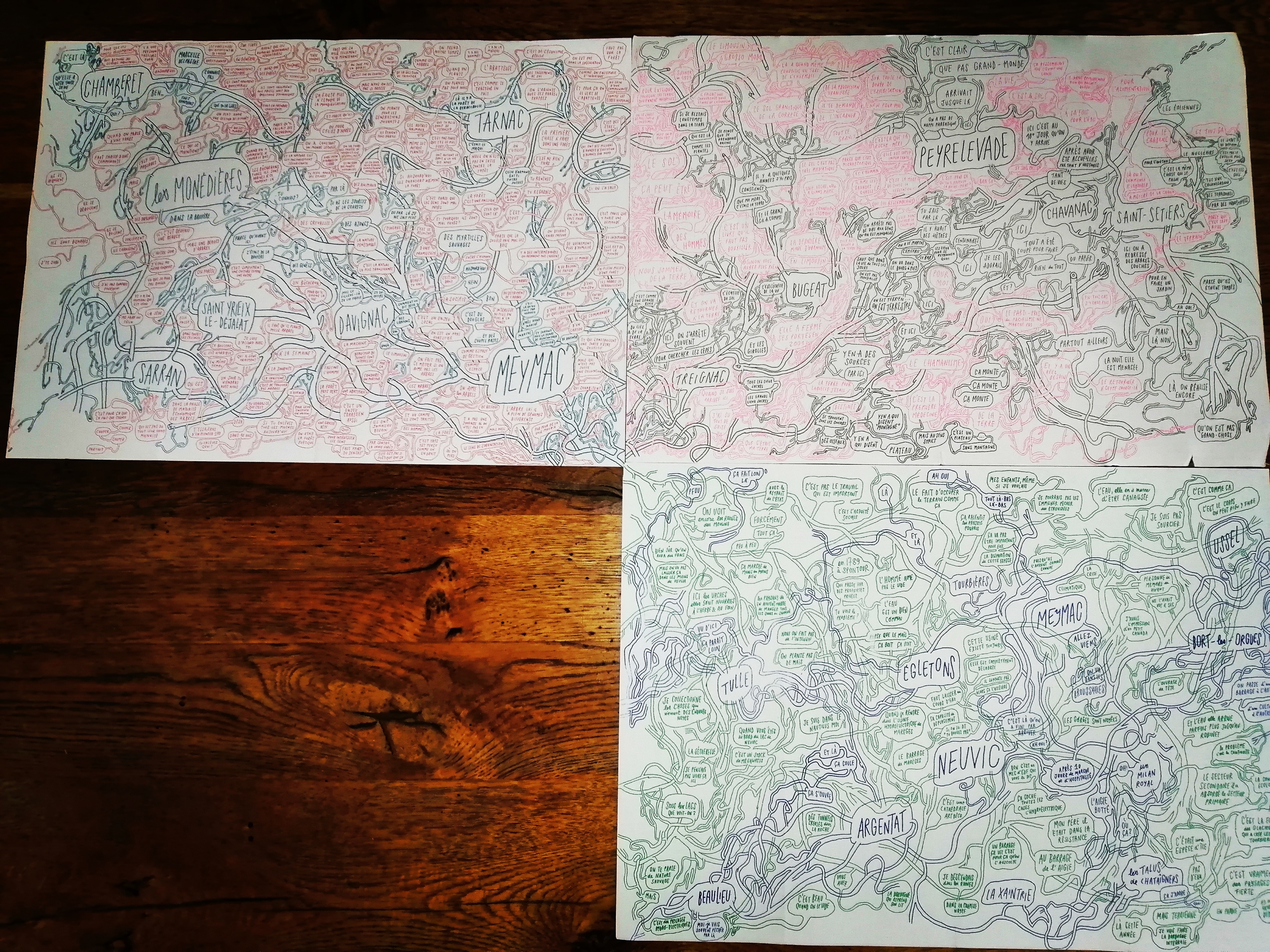 Troisième carte d’une série de quatre, la Carte de l’arbre & de la forêt s’est constituée au fil des rencontres lors la marche-enquête reliant Tulle à Meymac en passant par Brive en octobre 2021. La constellation de paroles des habitant·e·s s’est invitée dans lors de la résidence de création des Enchevêtré·e·s au lycée forestier de Meymac et sur des vitrines de la ville en octobre 2021, elle prend forme à présent dans sa version papier, imprimée en riso. Fragments de discussion, d’entretien ou d’atelier avec des habitant·e·s, s’y retrouvent pour composer un labyrinthe habité, une cartographie des conduites et contre-conduites qui écrivent, braconnent ou transgressent les espaces forestiers et les milieux vivants : après l’eau, le sol et l’air, voici donc la carte de l’arbre, un cheminement dans les forêts et les plantations limousines, le récit des constellations de la troisième marche-résidence entre Tulle, Argentat et Meymac illustrée par Saul Pandelakis (@saulpandelakis), imprimée par Vivien Gorse (@pepiteworld), écrite par Barbara Métais-Chastanier à partir de témoignages recueillis avec Sarah Métais-Chastanier (@sarahmc_pub).