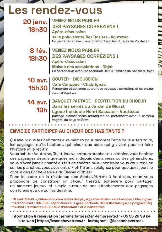 Le choeur des habitants de Voutezac-Objat, ouvert à toutes et tous, sans compétence théâtrale ou musicale particulière, sera créé pour l’occasion : rendez-vous pour un apéro discussion le 10 avril à Chabrignac au café Canopée pour en savoir plus !