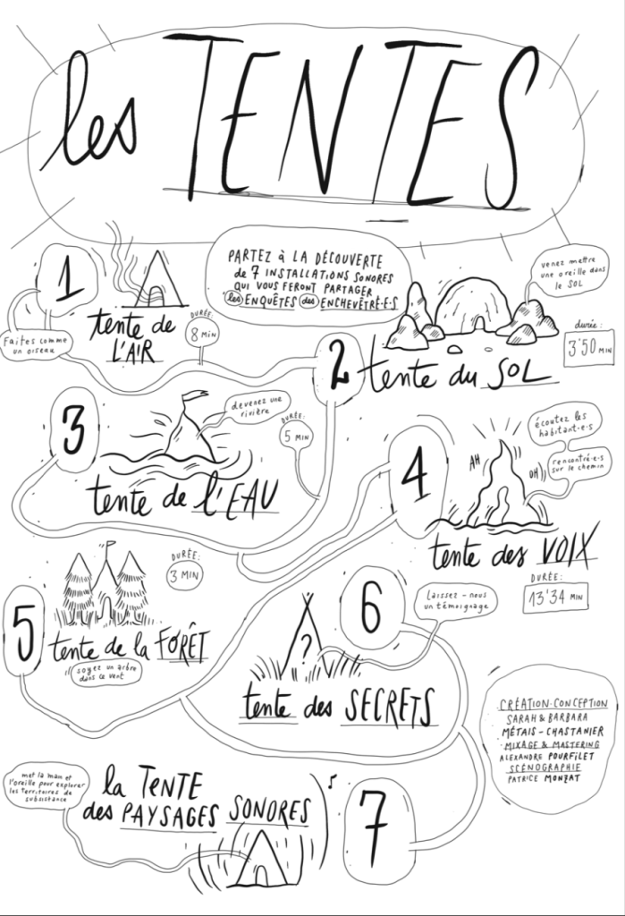 Cette installation se compose de 7 tentes de camping ou de tipis construits spécifiquement, accompagnés d’ardoises qui en guident la découverte. Dans six d’entre elles est diffusée une création sonore spatialisée – en lien avec le nom de la tente et l’expérience qu’elle permet de faire. Une septième permet de déposer un secret.